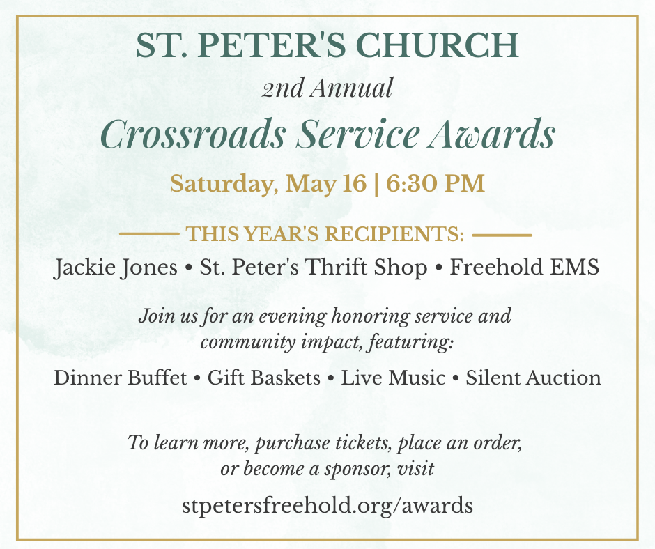 The St. Peter’s Crossroads Service Awards are presented each year to three individuals or organizations whose public service embodies that values that went into building Crossroads: Welcoming, Healing, and Celebration.